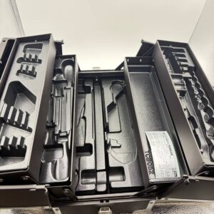 今回お持ち込みいただいたのは、シックなマットブラックが目を惹くV形3段式メタルケース入りの豪華セットです。ソケットからラチェットめがね、ドライバーまで、整備に欠かせない52点が凝縮された、まさに「一生モノ」の工具セットです。