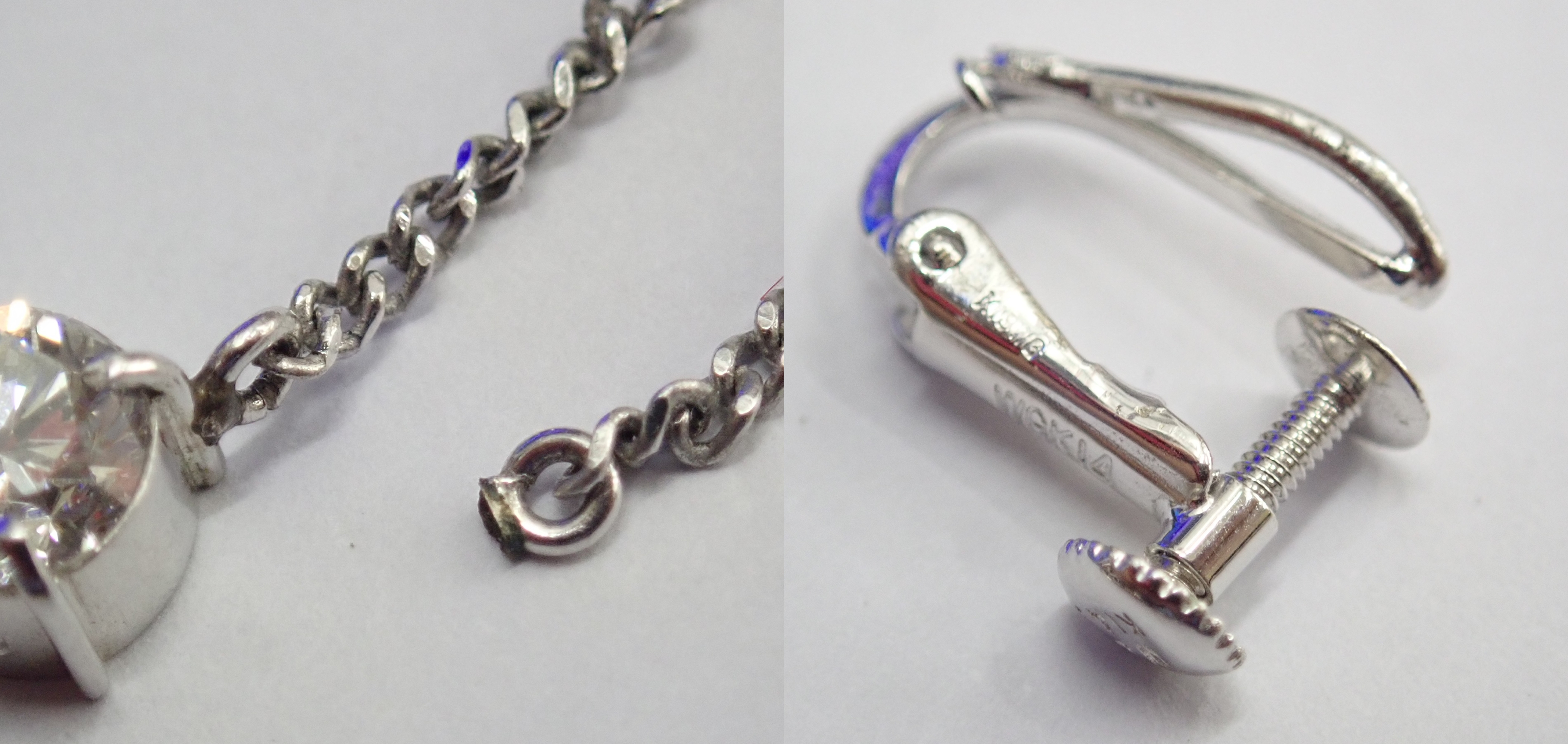 当店でもプラチナの切れたネックレスや石の取れたK14WGのイヤリングをお買取致しました。