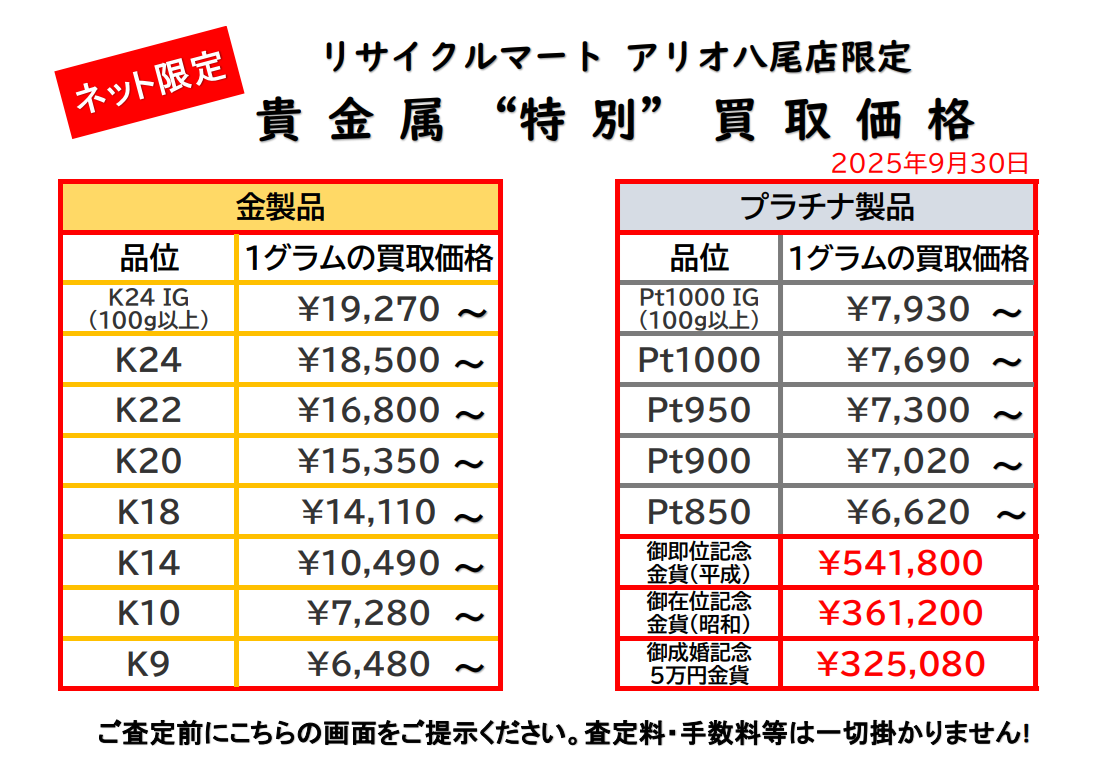 2025年9月30日 史上最高値を更新!本日の貴金属買取ネット特別価格です!