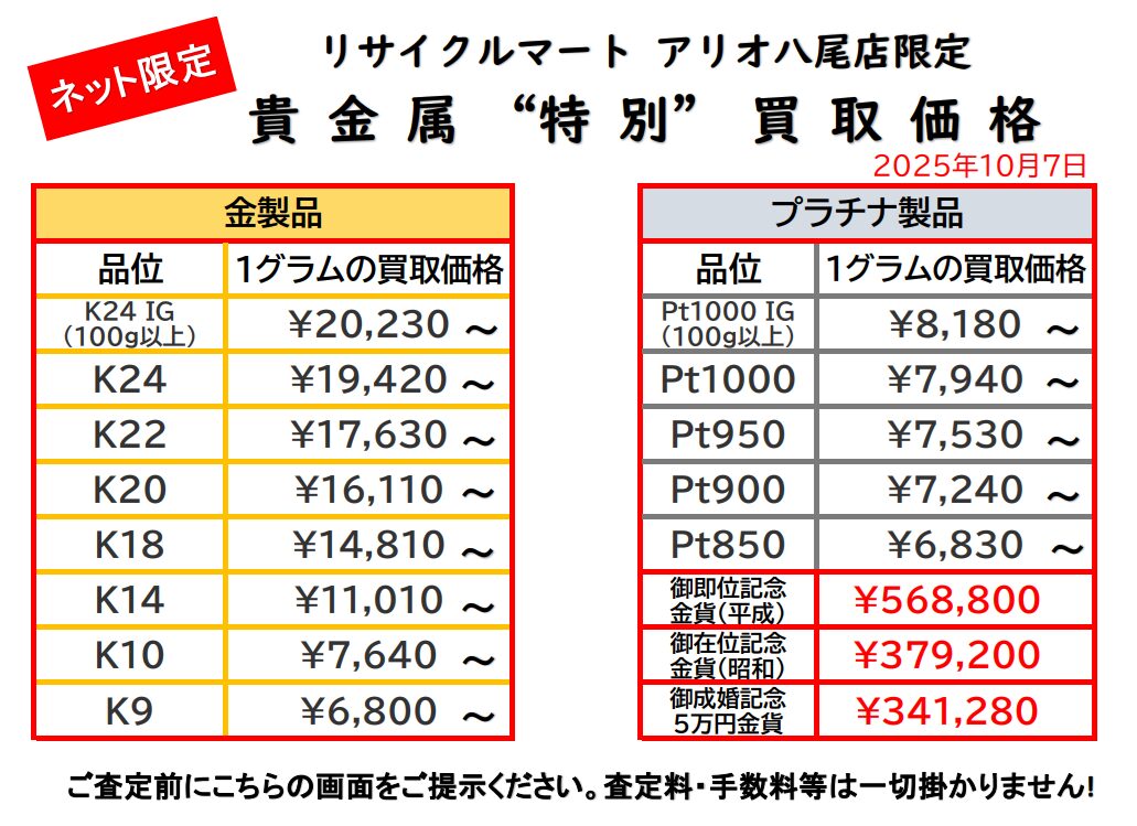 10/7 ネット限定貴金属買取価格です!高値更新中!