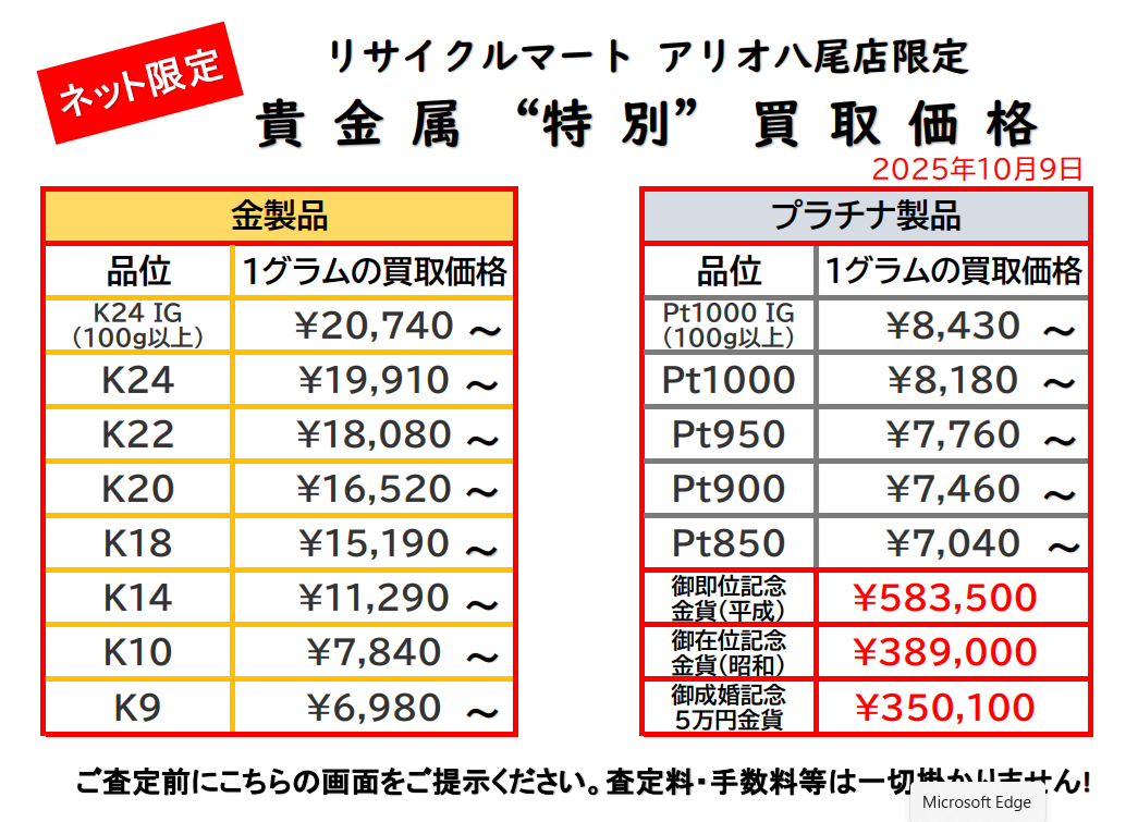 10/9 ネット限定貴金属買取価格です!史上最高値更新中!