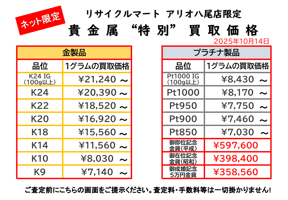 10/14 ネット限定貴金属買取価格です!史上最高値更新中!