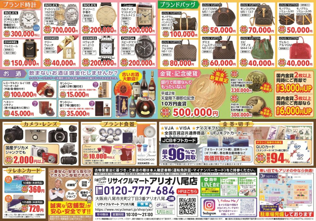 買取専門リサイクルマートアリオ八尾店では、安心と安全の買取サービスをご提供いたします。