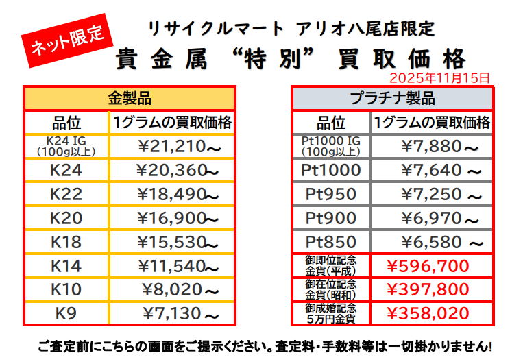 2025年11月12日の貴金属買取価格です。