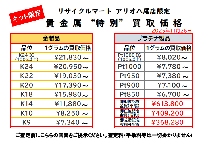 リサイクルマートアリオ八尾店の貴金属特別買取価格です。