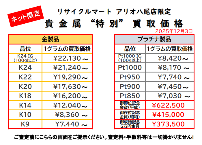 12/3 ネット限定!貴金属特別買取価格!はこちら 株価乱高下も金は底堅く高水準維持!