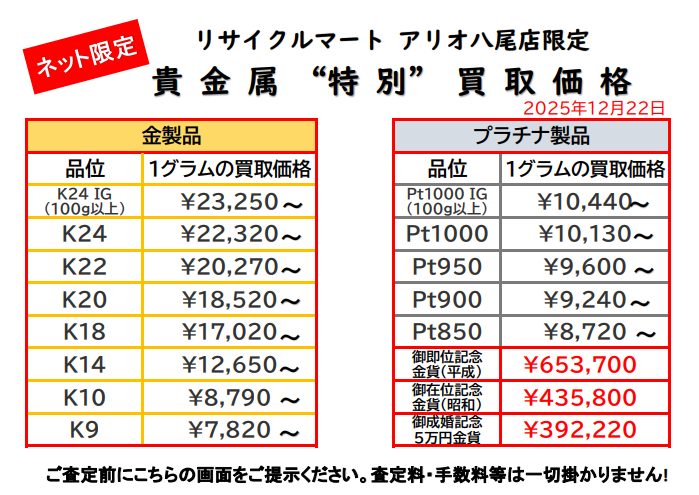 12/22 ネット限定!貴金属特別買取価格!