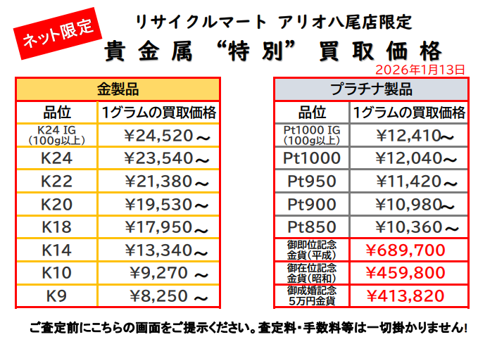 1/13 ネット限定貴金属価格です。