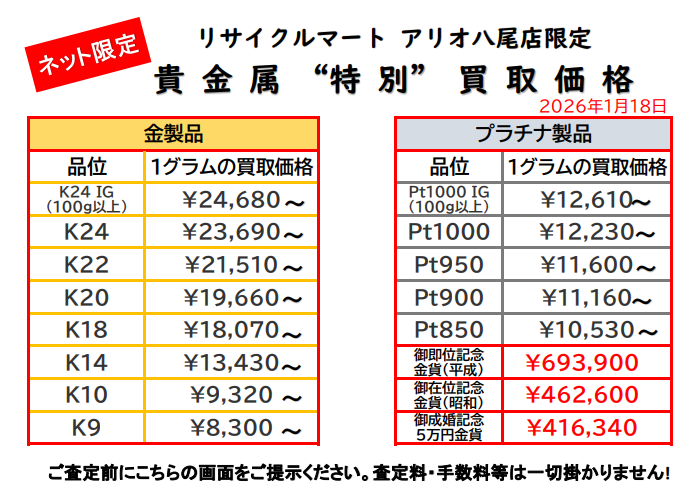 1/18 ネット限定!貴金属特別買取価格!