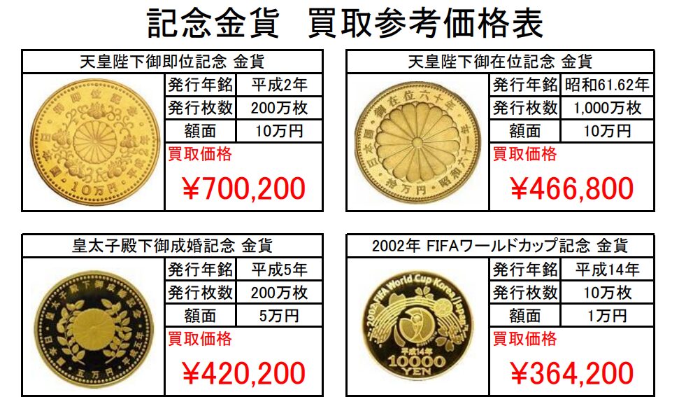 ■ 注目は「天皇陛下御即位記念10万円金貨」 平成2年に発行されたこの金貨は、純金30gという贅沢な仕様です。かつてはコレクションとして大切に保管されていたものですが、現在の相場では額面の10万円を大きく超え、状態やセット内容によっては70万円以上の高価買取になる事例も出ています!