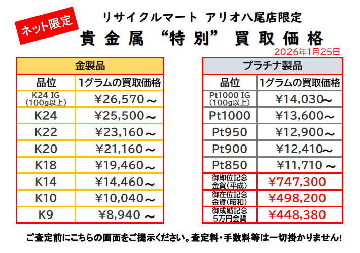 1/25 ネット限定!貴金属特別買取価格!