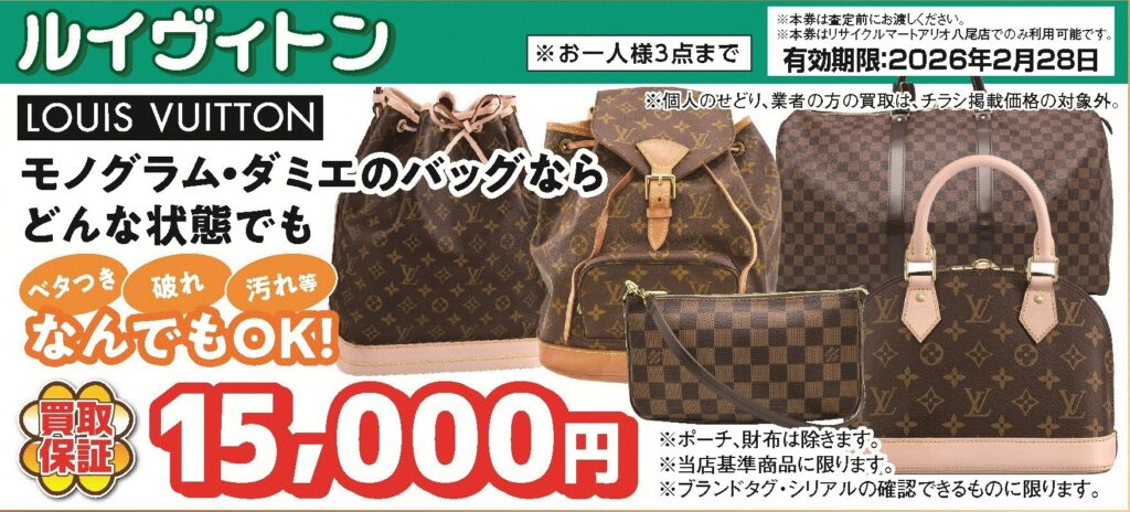 今、中古ブランド市場、特にルイ・ヴィトンの価値は世界的に高騰しています。リサイクルマートアリオ八尾店では、地域のお客様への感謝を込めて、どんなにボロボロな状態でもバッグを買い取る**「15,000円買取保証キャンペーン」**を期間限定で開催いたします。