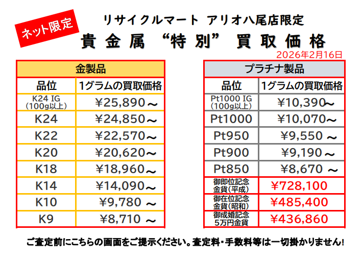 2/16 ネット限定貴金属買取価格です!