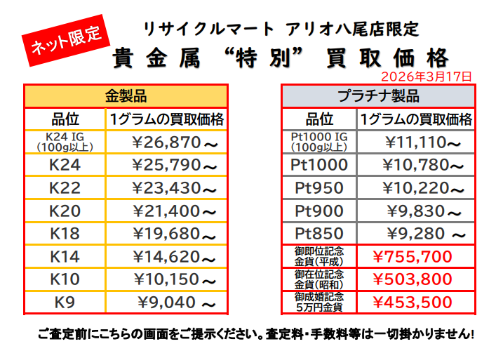 3/17 引き続き高水準!貴金属最新特別買取価格です!