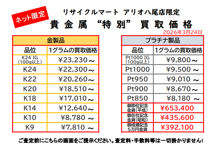 3/24 最新貴金属買取特別価格!市況下落開始で今が最後の売り時?!