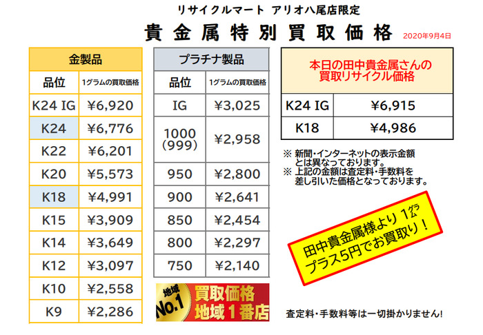 2020年9月4日 リサイクルマートアリオ八尾店 貴金属買取です。