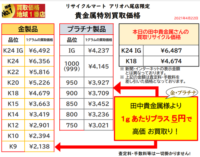 4月22日 一粒万倍日!金 プラチナ相場上昇! 金 プラチナを売るなら アリオ八尾のリサイクル ショップ リサイクルマートアリオ八尾店で!
