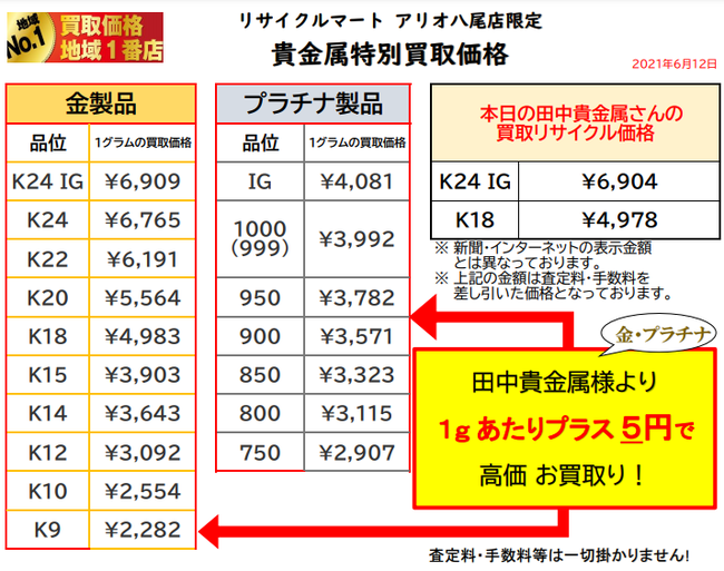 田中貴金属様、当日発表のリサイクル価格(買取価格)