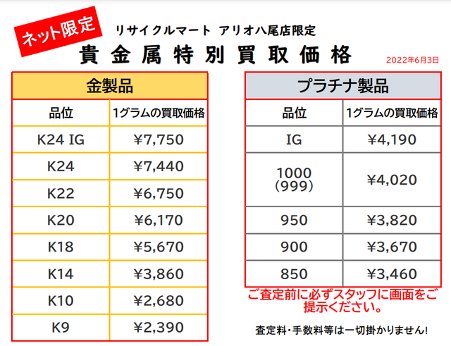 リサイクルマートアリオ八尾店 ホームページ限定、貴金属 特別 買取価格