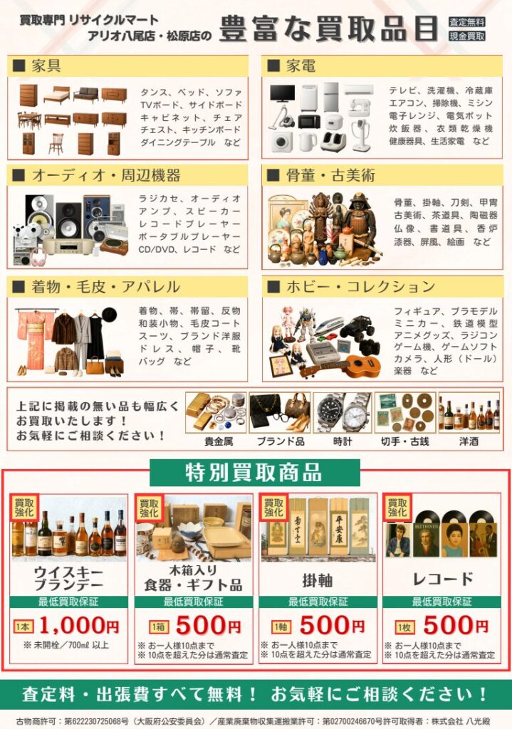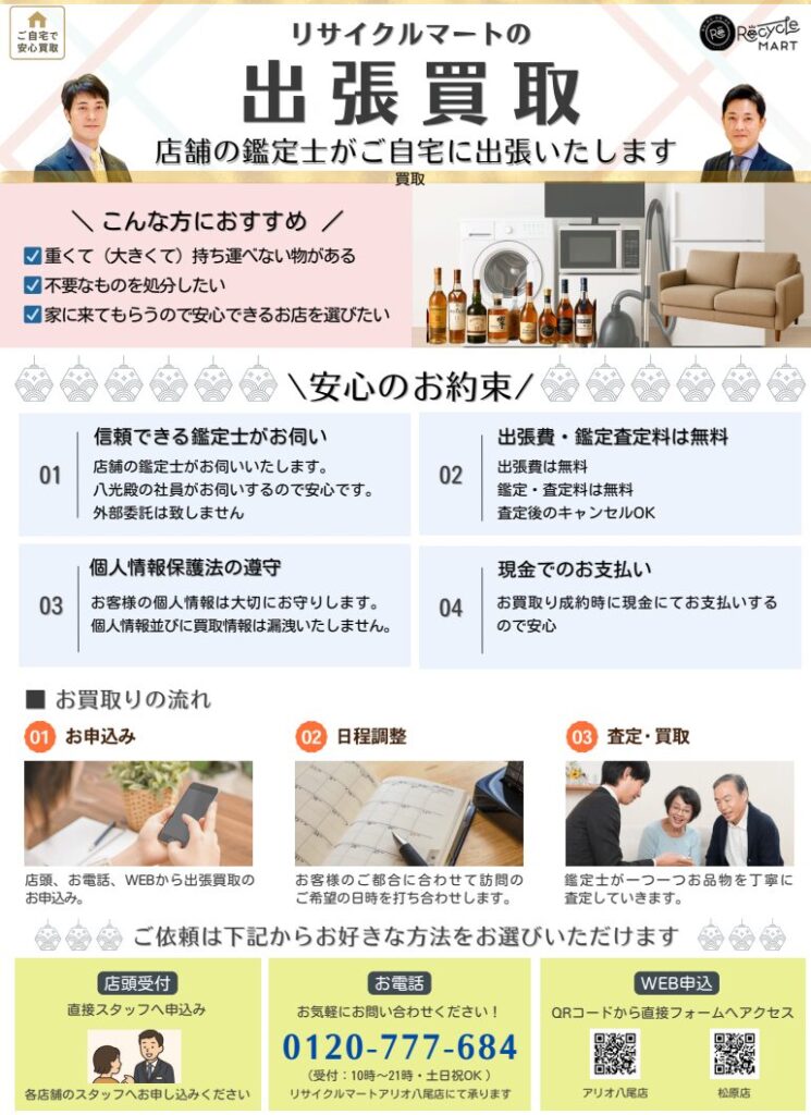 買取専門リサイクルマートアリオ八尾店では、安心と安全の買取サービスをご提供いたします。